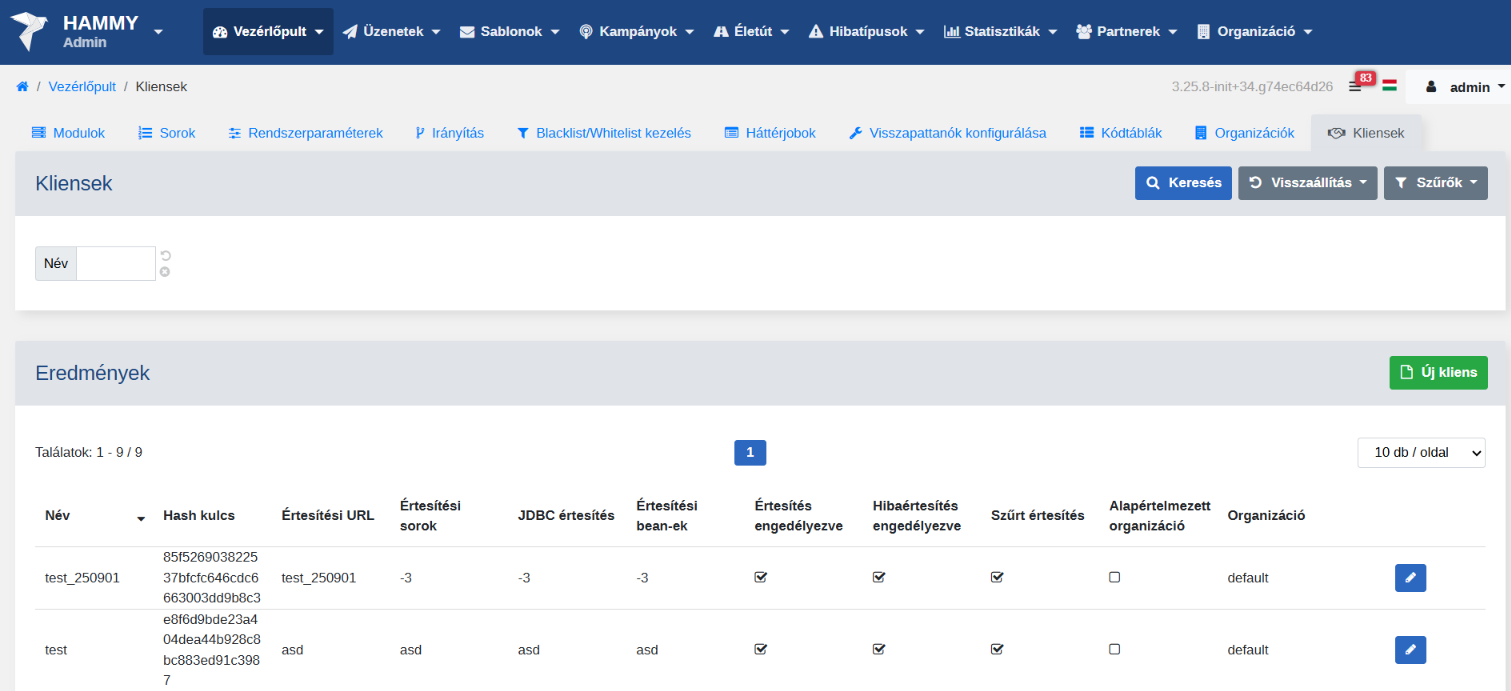 Ezeket a klienseket eddig csak az adatbázisban, kézi munkával lehetett létrehozni. Ebben az új verzióban létrehoztunk egy ‘Szerviz Kliensek’ menüpontot a ‘Vezérlőpult’ alatt, ahol létrehozhatóak, módosíthatóak a kliensek. Ezzel jóval egyszerűbbé vált a hozzáférés menedzselése, hisz egy HammyAdmin felhasználó, a megfelelő jogosultsággal az alkalmazások hozzáférési igényét tudja intézni.