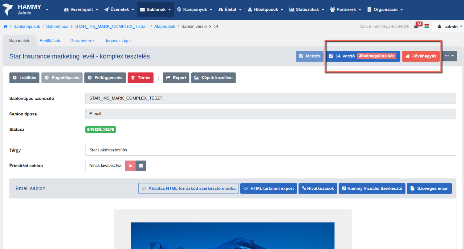 A sablonok élesítési folyamatát megbízhatóbbá tettük azáltal, hogy bevezettük a négyszem elvet a sablonok élesítésében. A funkció bekapcsolásával, egy sablon élesítéséhez két külön HammyAdmin felhasználó szükséges: az első user jóváhagyásra küldi-, a másik pedig jóváhagyja a sablont. Így két lépésben, négy emberi szem megtekintésével valósul meg a sablon használatban helyezése.